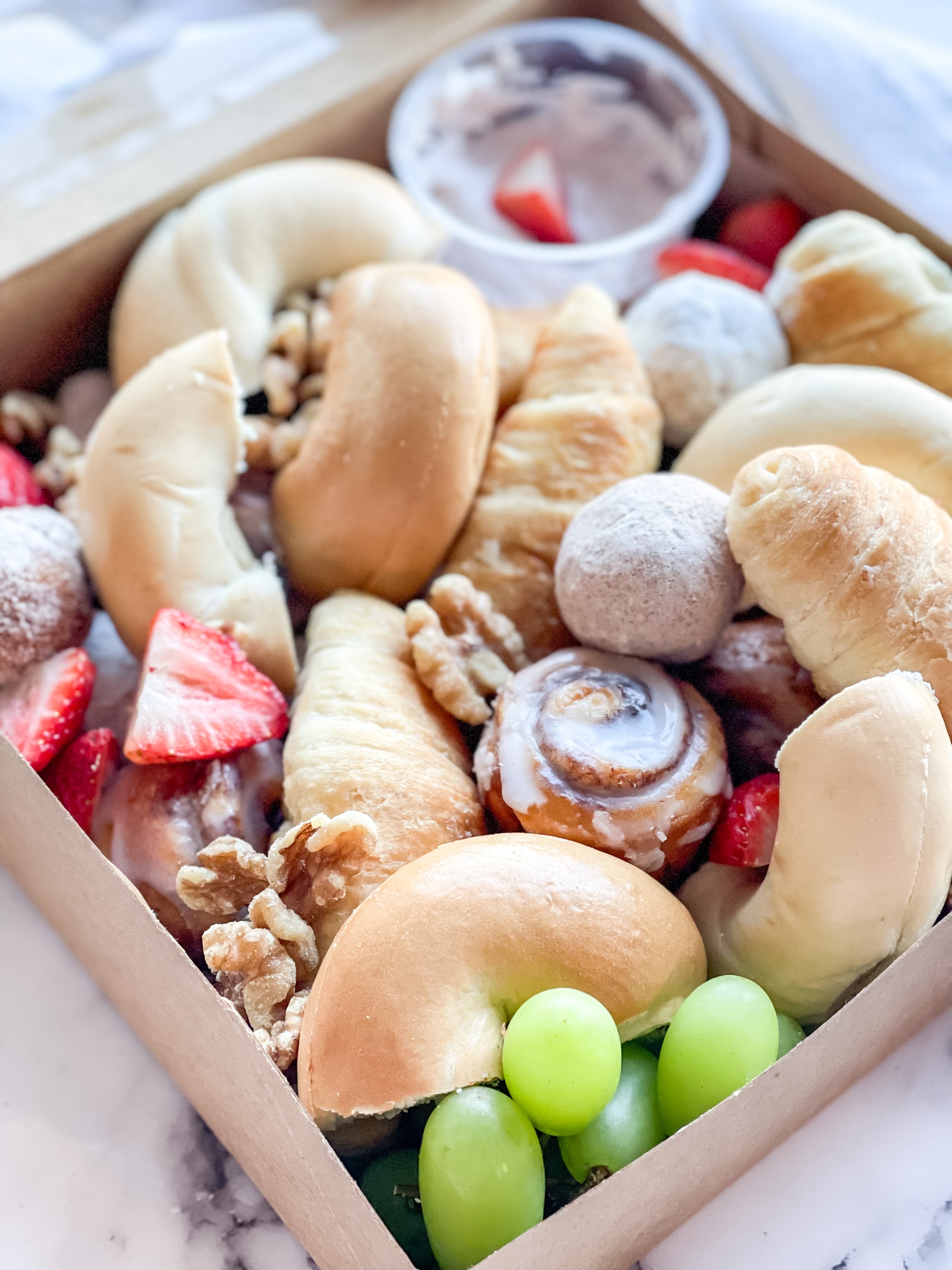 A variety of breakfast pastries, seasonal spreads, fruit, and nuts all beautifully arranged.